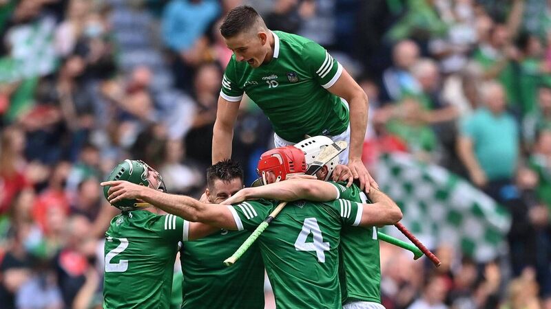 Gearóid Hegarty of Limerick, top, celebrates with team-mates after winning the All-Ireland SHC final in Croke Park, Dublin. Photo by Piaras Ó Mídheach/Sportsfile