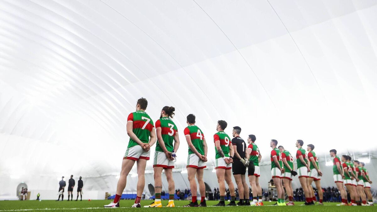 Mayo stand for the national anthem ahead of the provincial league semi-final at the Connacht GAA Air Dome. Picture: INPHO/Ryan Byrne