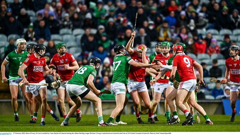 27 February 2022; Daire OLeary of Cork is tackled by Conor Boylan of Limerick during the Allianz Hurling League Division 1 Group A match between Limerick and Cork at TUS Gaelic Grounds in Limerick. Photo by Eóin Noonan/Sportsfile