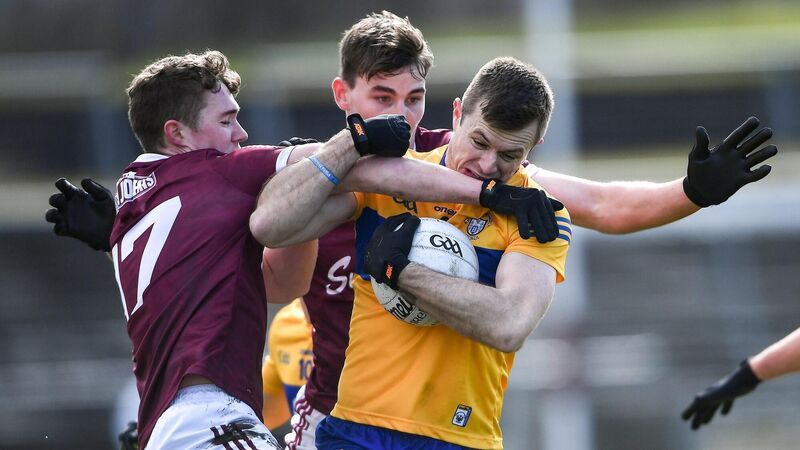 13 March 2022; Ciaran Russell of Clare in action against Jack Glynn, left, and Mathew Tierney of Galway during the Allianz Football League Division 2 match between Galway and Clare at Tuam Stadium in Tuam, Galway. Photo by Ray Ryan/Sportsfile