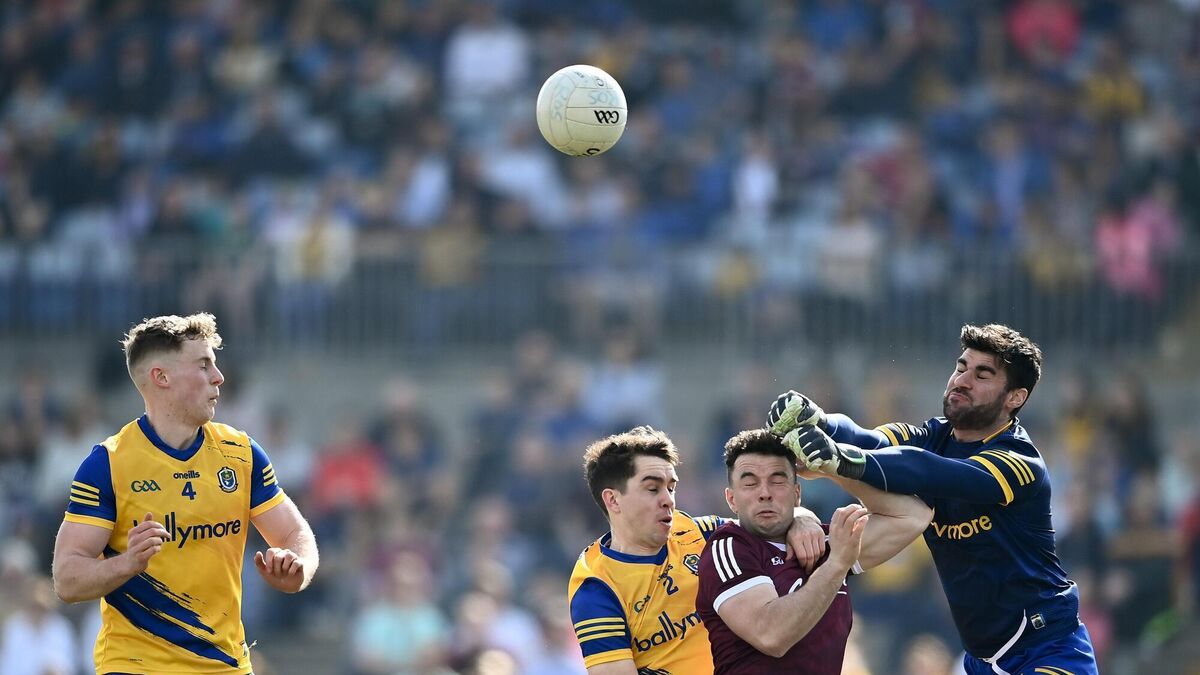 Roscommon goalkeeper Colm Lavin and David Murray in action against Dessie Conneely of Galway during the Allianz Football League Division 2 match at Dr Hyde Park in Roscommon.Â