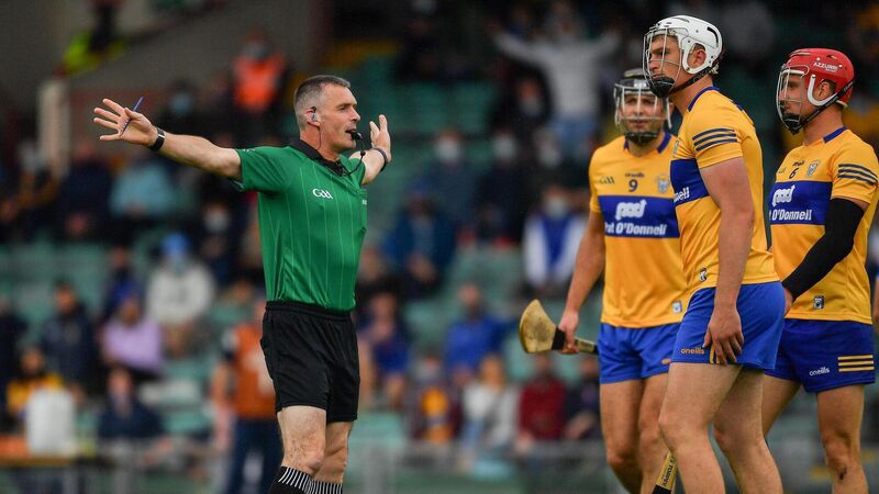 4 July 2021; Cathal Malone, Conor Cleary and John Conlon of Clare look on as referee James Owens awards a penalty to Tipperary during the Munster GAA Hurling Senior Championship Semi-Final match between Tipperary and Clare at LIT Gaelic Grounds in Limerick. Photo by Ray McManus/Sportsfile