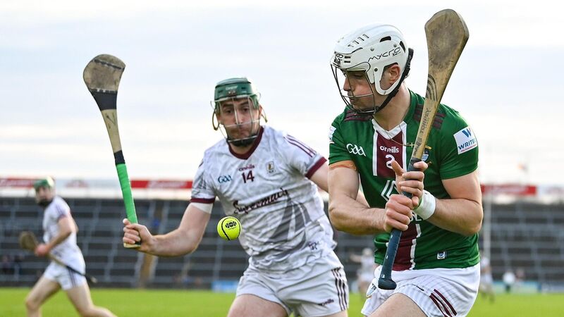23 April 2022; Conor Shaw of Westmeath in action against Brian Concannon of Galway during the Leinster GAA Hurling Senior Championship Round 2 match between Galway and Westmeath at Pearse Stadium in Galway. Photo by Seb Daly/Sportsfile