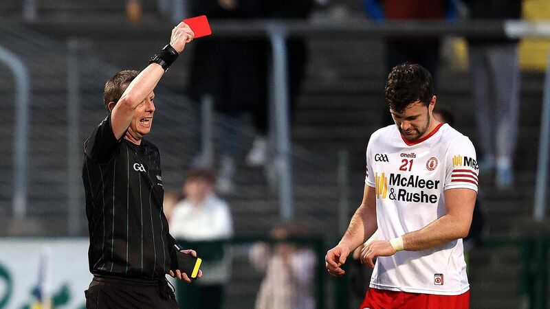 Scratch that: Referee Joe McQuillan shows Tyrone's Conor McKenna a red card during the clash with Fermanagh. The card was rescinded on appeal to the CHC. Photo: INPHO/Bryan Keane