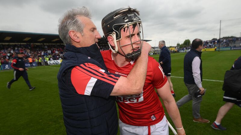 15 May 2022; Cork manager Kieran Kingston celebrates with Darragh Fitzgibbon after the Munster GAA Hurling Senior Championship Round 4 match between Waterford and Cork at Walsh Park in Waterford. Photo by Stephen McCarthy/Sportsfile