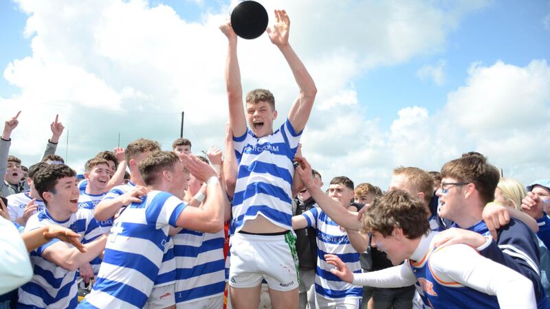THRILLER: Colaiste Choilm Ballincollig captain Cian O'Driscoll celebrates with his teammates after capturing the Cork Senior B Colleges Hurling title with a victory over Mitchelstown CBS in Rathcormac.