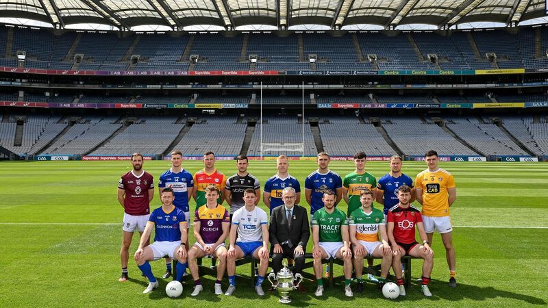 16 May 2022; In attendance at the launch of the 2022 Táilteann Cup, at Croke Park in Dublin, are back row, from left, Kevin Maguire of Westmeath, Evan O’Carroll of Laois, Darragh Foley of Carlow, Niall Murphy of Sligo, Teddy Doyle of Tipperary, Killian Clarke of Cavan, Mark Diffley of Leitrim, Dean Heal of Wicklow, Conor Stewart of Antrim. Front row, from left, Mickey Quinn of Longford, Martin O’Connor of Wexford, Conor Murray of Waterford, Uachtarán Chumann Lúthchleas Gael Larry McCarthy, Declan McCusker of Fermanagh, Johnny Moloney of Offaly and Barry O’Hagan of Down. Photo by Ramsey Cardy/Sportsfile