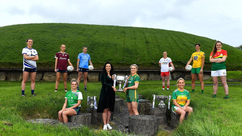 24 May 2022; Máire NĂ Bhraonáin of TG4 and Orlagh Lally of Meath with the Brendan Martin cup and players from the Intermediate, Junior and Senior Championships, from left, Karen McGrath of Waterford, Olivia Divilly of Galway, RĂłisĂn Ambrose of Limerick, Jennifer Dunne of Dublin, Niamh O'Neill of Tyrone, Clare Owens of Leitrim, Susanne White of Donegal and ClĂodhna NĂ ShĂ© of Carlow at the Knowth megalithic passage-tomb site in County Meath. Photo by Brendan Moran/Sportsfile