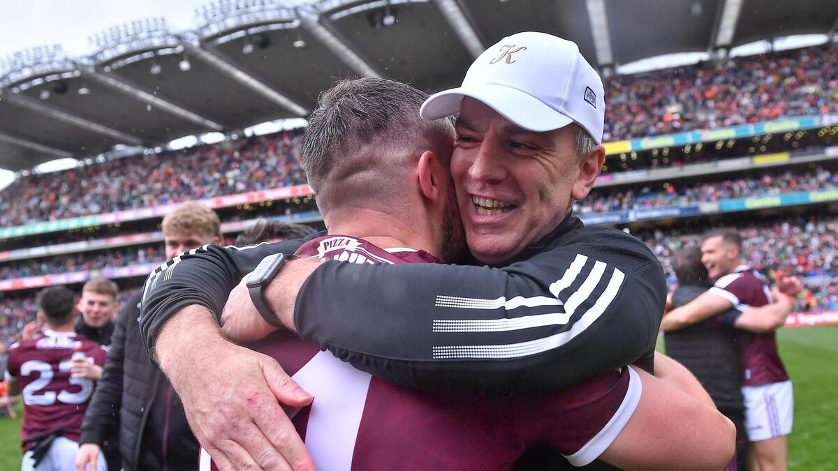 HUG IT OUT: Galway manager Padraic Joyce celebrates with Damien Comer after their All-reland SFC quarter-final win over Armagh and Galway at Croke Park.