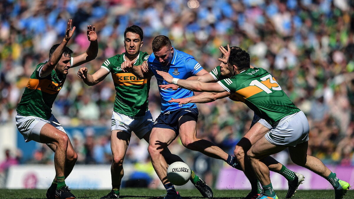 SURROUNDED: Ciarán Kilkenny of Dublin in action against Kerry players, from left, Graham O'Sullivan, Brian Ó Beaglaíoch, Gavin White and Paudie Clifford during the GAA Football All-Ireland Senior Championship Semi-Final match between Dublin and Kerry at Croke Park in Dublin. Pic: Piaras Ó Mídheach/Sportsfile