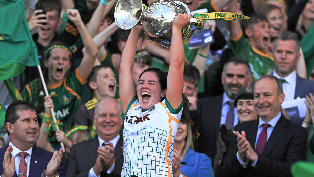 BIG STAGE:Meath captain Shauna Ennis lifts the trophy. Pic: INPHO/Leah Scholes