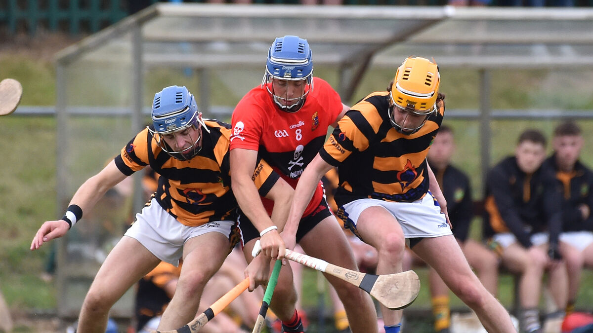 BATTLE: Diarmuid Kearney, UCC getting between Avondhu players Eoin McGrath and Darragh O'Reilly during their Co-Op Superstores Cork Premier SHC divisions/colleges semi-final match at Mourneabbey. Picture Dan Linehan
