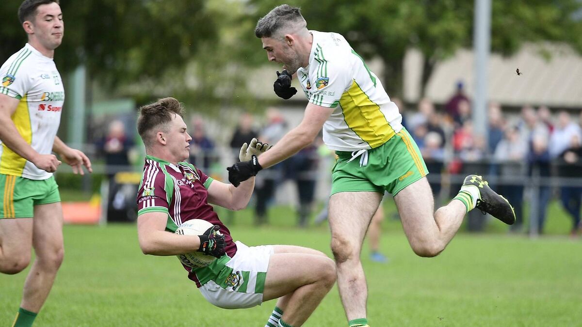 It got progressively worse for last year’s junior champions when their goalkeeper Kevin Murphy received a black card in the 25th minute for pulling down Brian Dineen, the resultant penalty despatched to the net by Thompson.