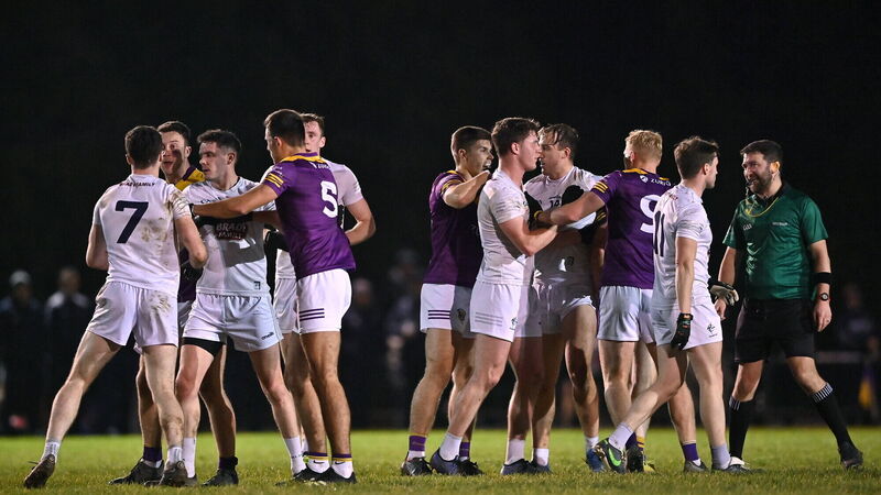 BATTLE: Players tussle during the O'Byrne Cup Group A Round 1 match between Wexford and Kildare at St Patrick's Park in Enniscorthy, Wexford. Pic: Piaras Ó Mídheach/Sportsfile