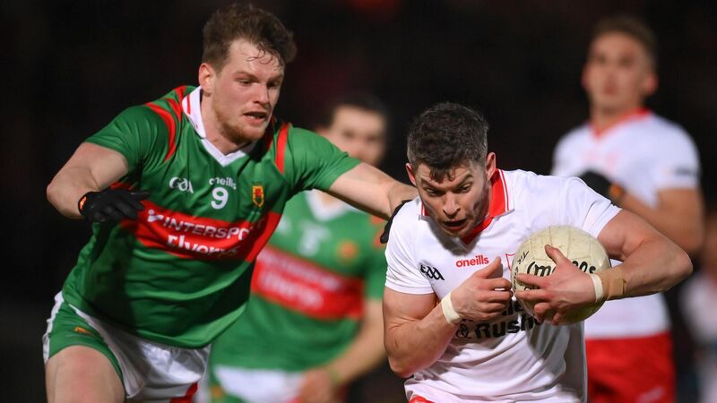 LEAGUE IMPORTANCE: Richard Donnelly of Tyrone in action against Matthew Ruane of Mayo during the Allianz Football League Division 1 match between Tyrone and Mayo at O'Neill's Healy Park. Pic: Stephen McCarthy/Sportsfile
