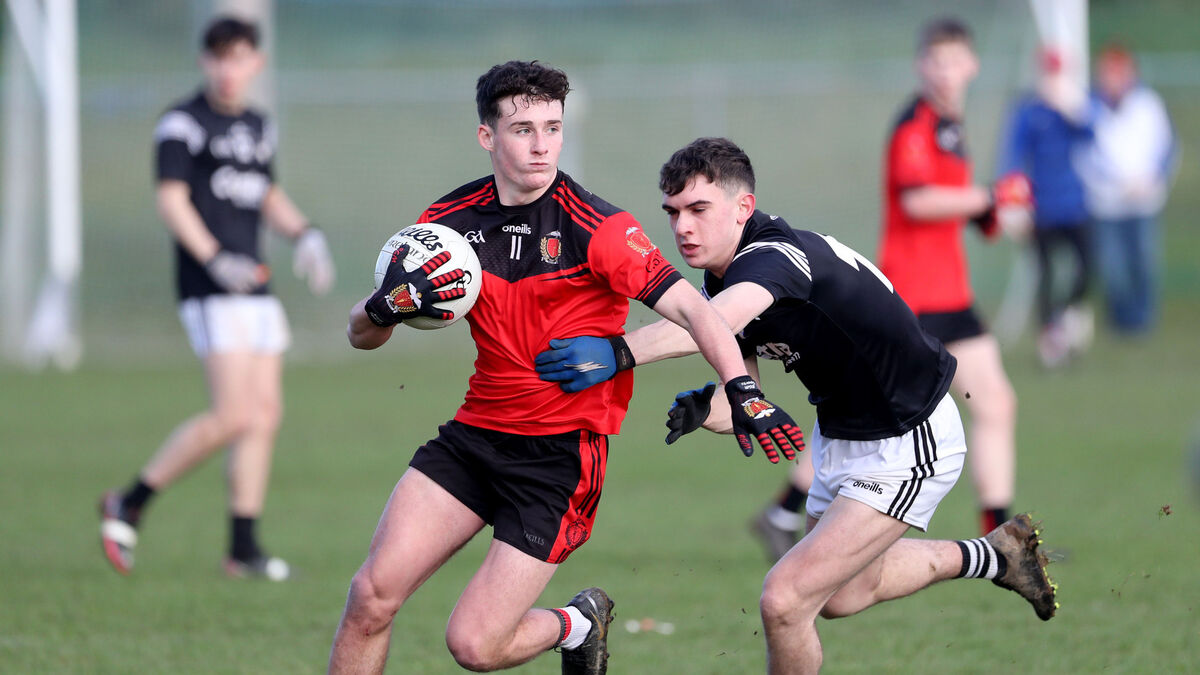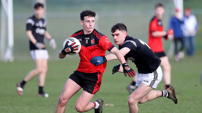 Rob Hanley, St Francis College tries to evade Odhran Foley, Coláiste An Spioraid Naomh at Mallow GAA Complex on Saturday. Picture: Jim Coughlan.