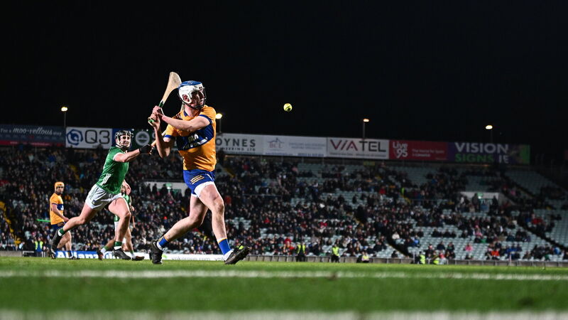 Diarmuid Ryan of Clare scores a point despite the efforts of Darragh O'Donovan of Limerick at TUS Gaelic Grounds in Limerick. Picture: Eóin Noonan/Sportsfile
