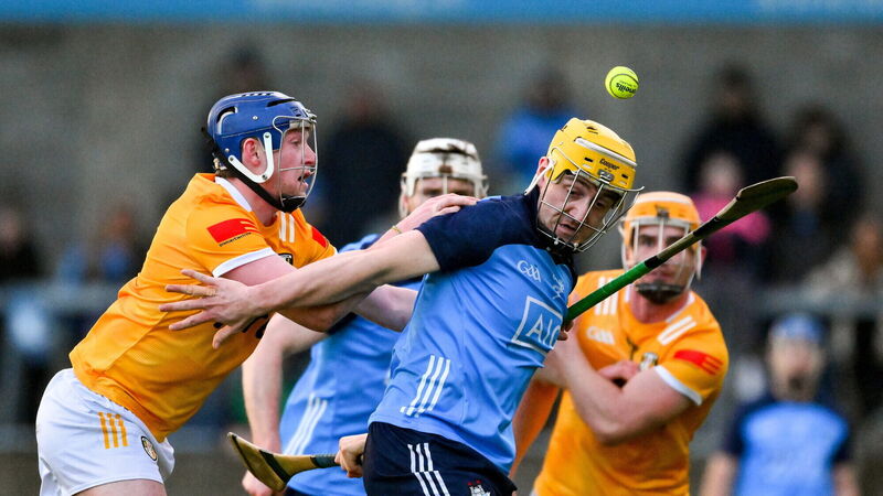 Dáire Gray of Dublin is tackled by Keelan Molloy of Antrim. Picture: Ray McManus/Sportsfile