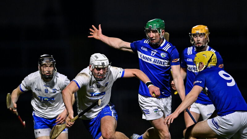 Neil Montgomery of Waterford in action against Ross King, 17, and Ian Shanahan, 9, of Laois. Pic: Piaras Ó Mídheach/Sportsfile