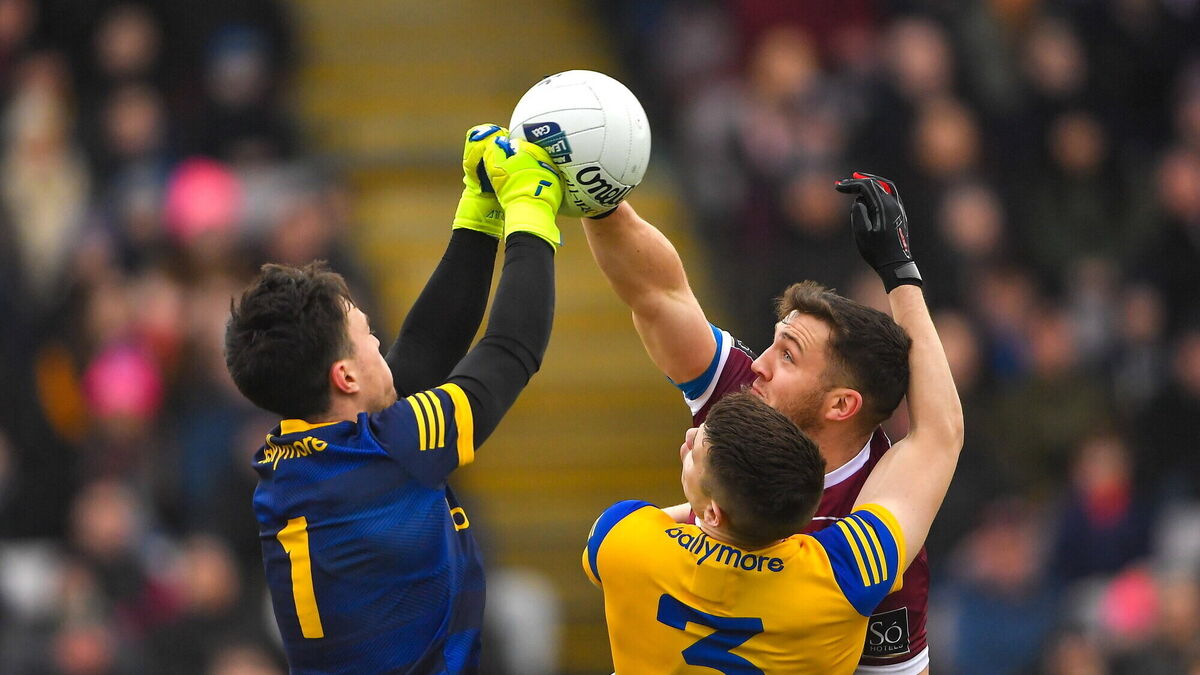 Roscommon goalkeeper Conor Carroll punches a ball away despite the challenge from Damien Comer of Galway. Picture: Ray Ryan/Sportsfile