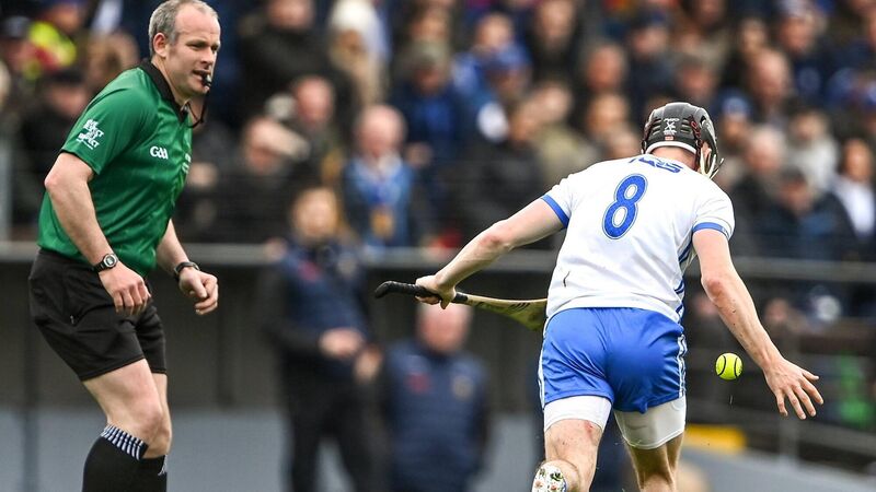 CLAMPING DOWN: Darragh Lyons of Waterford handpasses the ball as referee Johnny Murphy looks on. Pic: Piaras Ó Mídheach/Sportsfile