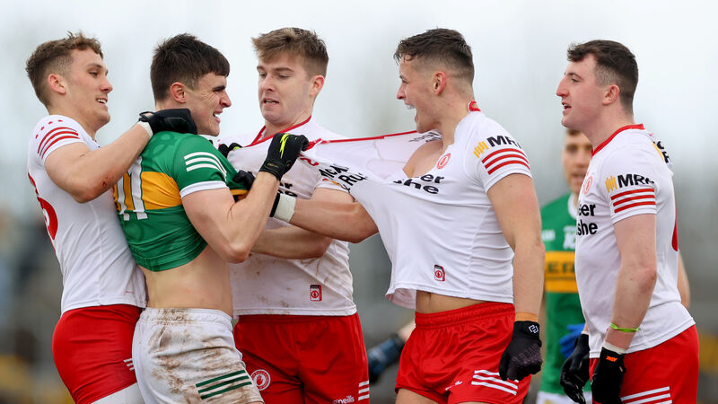 PULLING AND DRAGGING: Tyrone’s Conn Kilpatrick, Cormac Quinn, Michael McKernan and Cormac Meyler clash with Séan O'Shea of Kerry. Picture: INPHO/James Crombie
