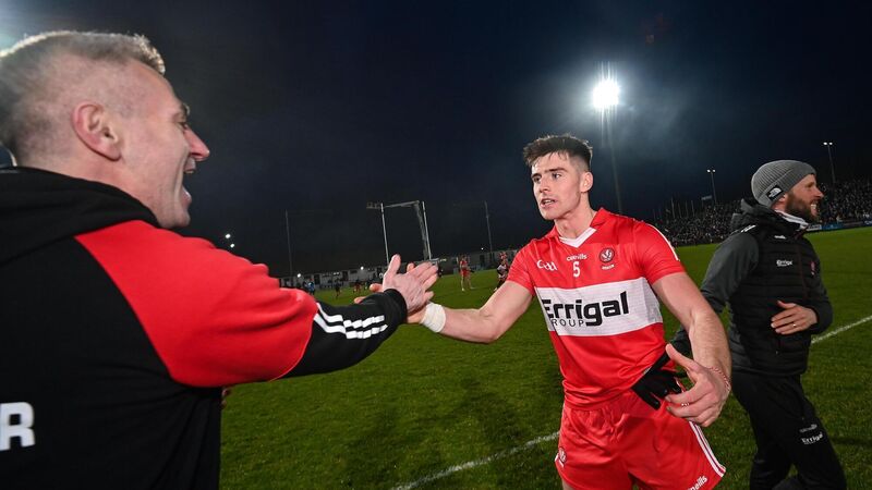 JOB DONE: Derry manager Rory Gallagher and Conor Doherty of Derry celebrate after the Allianz Football League Division 2 match against Dublin at Celtic Park in Derry. Pic: Ramsey Cardy/Sportsfile