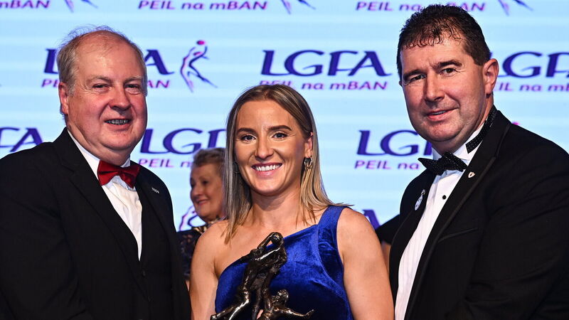DUE SOUTH: TG4 Senior Players Player of the Year Niamh McLaughlin of Donegal is presented with her award by Ard Stiúrthóir TG4 Alan Esslemont, left, and President of the LGFA MÃcheál Naughton. Picture: Eóin Noonan/Sportsfile