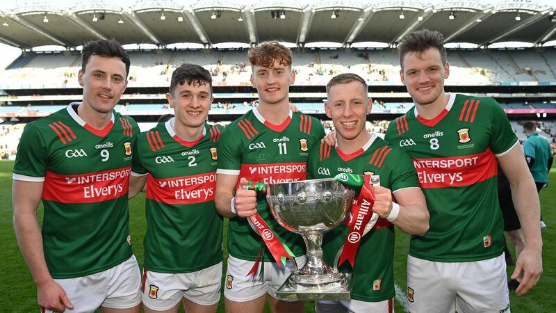 CHAMPIONSHIP OPENER: Mayo players, from left, Diarmuid O'Connor, Jack Coyne, Jack Carney, Ryan O'Donoghue and Matthew Ruane with the cup after the Allianz Football League Division 1 Final match between Galway and Mayo at Croke Park in Dublin. Photo by Ramsey Cardy/Sportsfile