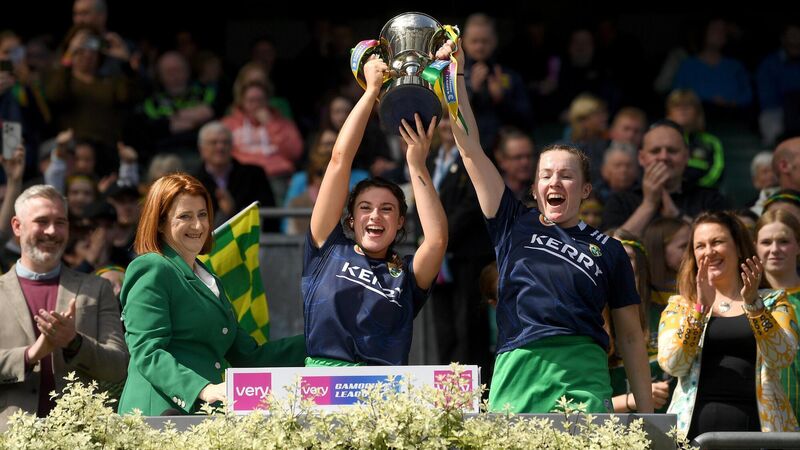HISTORIC WIN: Kerry joint captains Clodagh Walsh, left, and Sara Murphy lift the cup after the Very Camogie League Final Division 2A final at Croke Park. Pic: Eóin Noonan/Sportsfile
