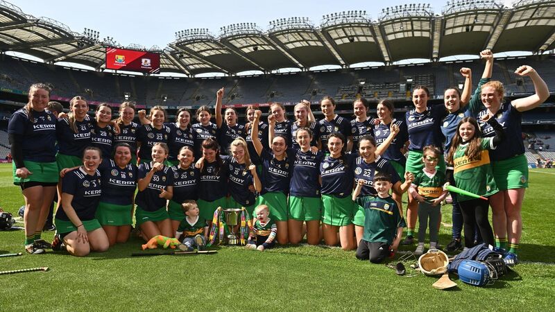 SILVERWARE SECURED: Kerry players celebrate with the cup after the Very Camogie League Final Division 2A match against Meath at Croke Park in Dublin. Pic: Eóin Noonan/Sportsfile