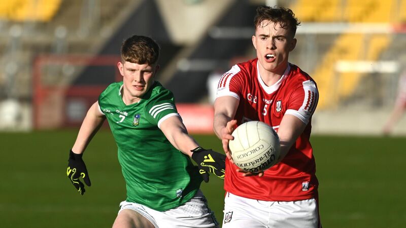 LAYOFF: Cork's Thomas O'Mahony wins the ball from Limerick's Ciaran O'Sullivan during the EirGrid Munster Under 20 FC semi final at Pairc Ui Chaoimh. Pic: Eddie O'Hare