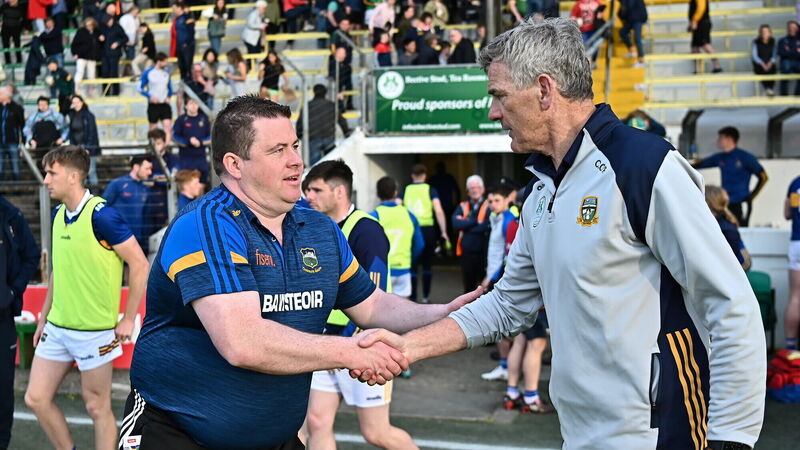 UP AND RUNNING: Tipperary manager David Power and Meath manager Colm O'Rourke after the Tailteann Cup Group 2 Round 1 match. Picture: Tyler Miller/Sportsfile