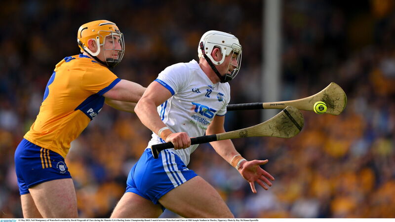 TOUGH DAY: Neil Montgomery of Waterford is tackled by David Fitzgerald of Clare during the Munster SHC clash at FBD Semple Stadium in Thurles. Pic: Ray McManus/Sportsfile