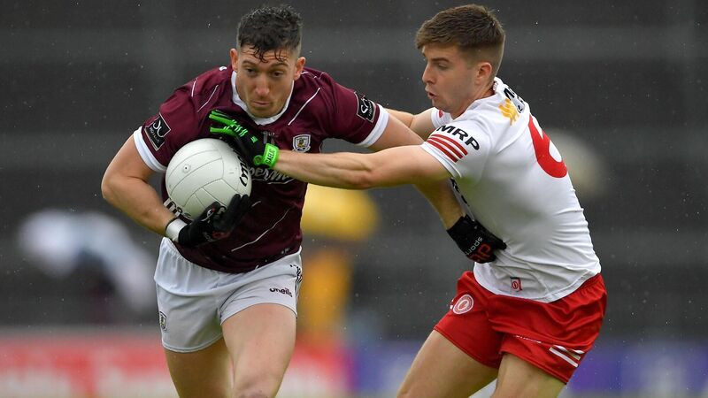 HAND OFF: Johnny Heaney of Galway in action against Cormac Quinn of Tyrone during the All-Ireland SFC round 1 match at Pearse Stadium in Galway. Pic: Ray Ryan/Sportsfile