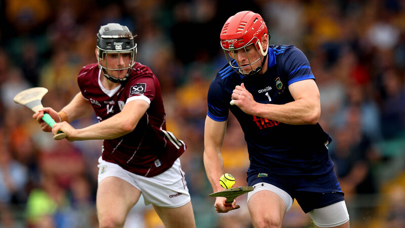 UNDER PRESSURE: Galway’s Kevin Cooney challenges Tipperary goalkeeper Rhys Shelly. Pic: INPHO/Ryan Byrne