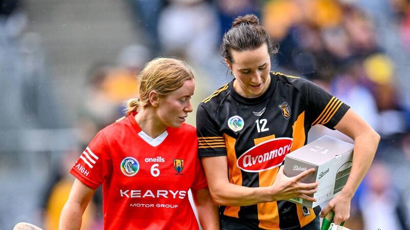 Laura Tracey of Cork and Kilkenny's Denise Gaule after the All-Ireland Senior Camogie Championship quarter-final match last weekend. Picture: Piaras Ó Mídheach/Sportsfile