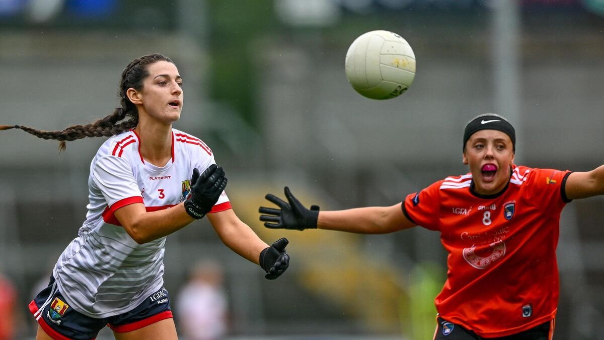 FLYING FORM: Eimear Meaney of Cork in action against Niamh Coleman of Armagh during the TG4 Ladies Football All-Ireland Senior Championship quarter-final match between Armagh and Cork at BOX-IT Athletic Grounds in Armagh. Pic: Ben McShane/Sportsfile
