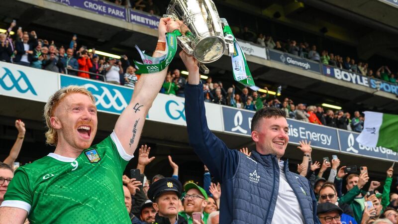 LEADERS: Limerick players Cian Lynch, left, and Declan Hannon lift the Liam MacCarthy Cup after their side's victory in the All-Ireland SHC final at Croke Park. Pic: Ray McManus/Sportsfile