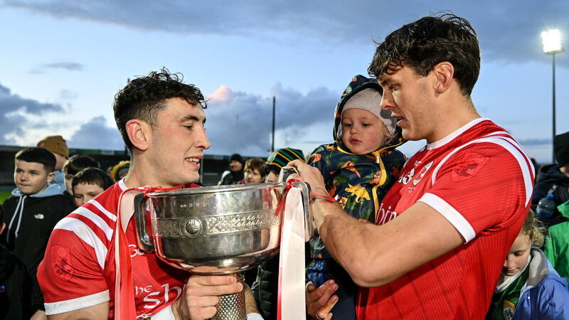 FAMILY DO: East Kerry captain Paudie Clifford, left, and brother David Clifford, and David's son Ogie, celerate with the Bishop Moynihan cup after the Kerry County Senior Football Championship final. Pic: Brendan Moran/Sportsfile