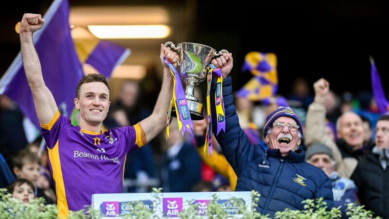 CHAMPIONS: Kilmacud Crokes captain Shane Cunningham lifts the Sean McCabe cup with kitman Vinny Patterson. Photo by Stephen Marken/Sportsfile