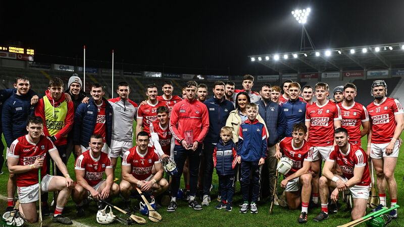 FITTING EVENING'S WORK: Cork players with Sinead McCarthy, daughter of the late Teddy McCarthy, and Chairperson Cork GAA Marc Sheehan, after the Teddy McCarthy hurling tribute game between Cork and Galway at Páirc Uí Chaoimh in Cork. Pic: Eóin Noonan/Sportsfile