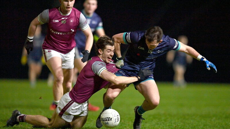 TIGHT HOLD: TU Dublin's Darragh Campion is tackled by Cian Monaghan of University of Galway in Tuesday night's Sigerson Cup clash at Dangan. Picture: Stephen Marken/Sportsfile