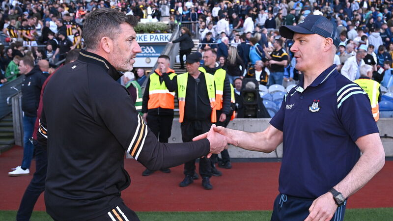 Kilkenny manager Derek Lyng, left, and Dublin manager Micheál Donoghue shake hands at Croke Park. Pic: Seb Daly/Sportsfile