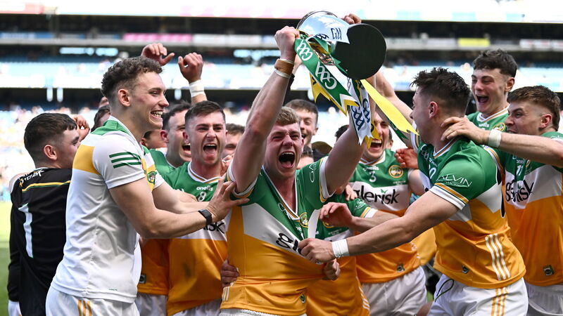 CORK DATE: Killian Sampson of Offaly holds the cup aloft as he celebrates with teammates after their side's victory in the Joe McDonagh Cup final match between Laois and Offaly at Croke Park in Dublin. Pic: Piaras Ó MÃdheach, Sportsfile