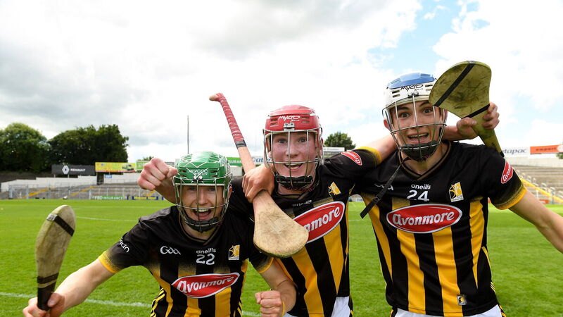 FINAL FEELING: Kilkenny players from left Patrick Lacey, Jake Mullen and Louis Raggett celebrate after the Electric Ireland GAA Hurling All-Ireland Minor Hurling Championship Semi-Final match between Kilkenny and Clare at FBD Semple Stadium in Thurles, Tipperary. Photo by Matt Browne/Sportsfile