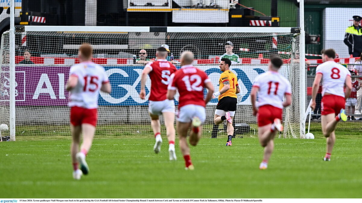 Tyrone goalkeeper Niall Morgan runs back to his goal during the All-Ireland SFC group stage game against Cork. Picture: Piaras Ó Mídheach/Sportsfile