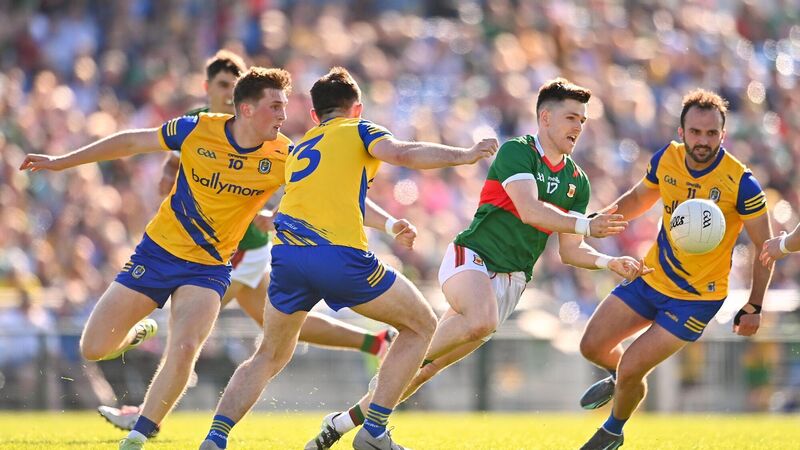 Fergal Boland of Mayo in action against Roscommon players. Photo by Ben McShane/Sportsfile