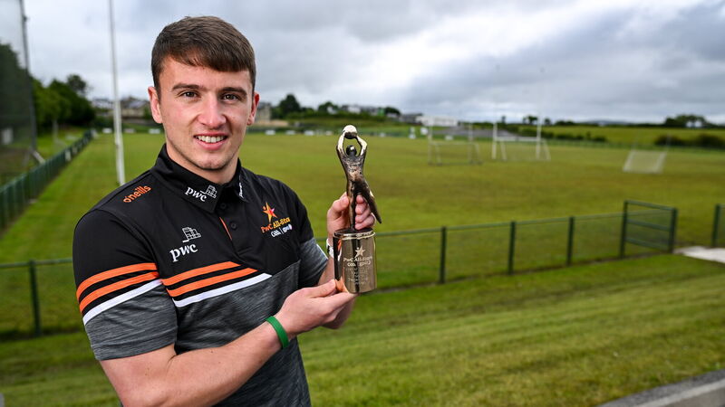 PERFECT TIMING: PwC GAA/GPA Player of the Month for May in football, Peadar Mogan of Donegal, with his award at his club Naomh Naille GAA in Mountcharles, Donegal. Pic: Brendan Moran/Sportsfile