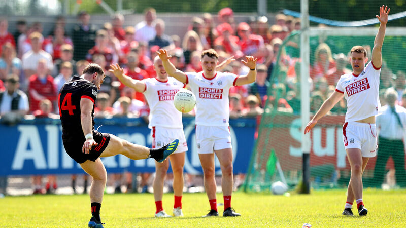 WORK TO DO: Louth’s Sam Mulroy scores a free to put his side into the lead in the last minute, which knocked Cork out of the championship. Pic: Ryan Byrne, Inpho